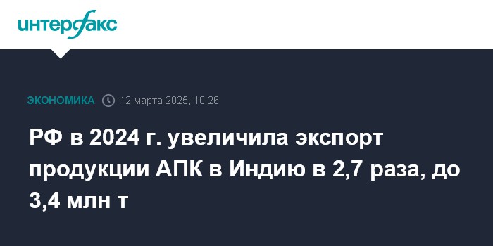 РФ в 2024 г. увеличила экспорт продукции АПК в Индию в 2,7 раза, до 3,4 млн т