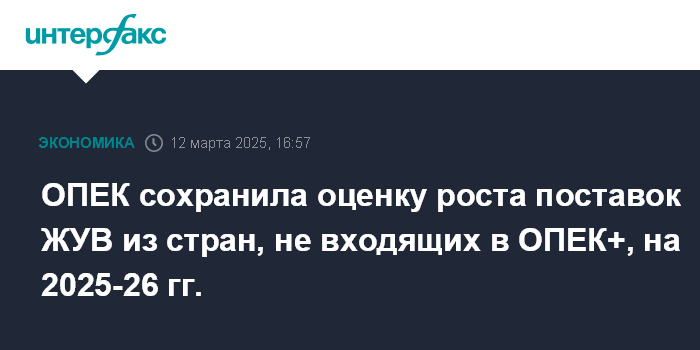 Москва. 12 марта. INTERFAX.RU - ОПЕК сохранила оценку роста поставок жидких углеводородов из стран, не входящих в ОПЕК+, на 2025 и 2026 годы, говорится в ежемесячном отчете альянса.