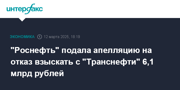 Москва. 12 марта. INTERFAX.RU - "Роснефть" подала апелляционную жалобу на решение Арбитражного суда Москвы, который отклонил иск НК к "Транснефти" о взыскании 6,1 млрд рублей.