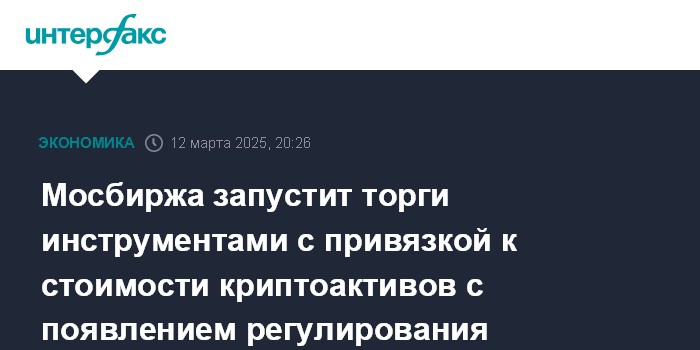 Москва. 12 марта. INTERFAX.RU - "Московская биржа" готова запустить торги инструментами, привязанными к стоимости криптоактивов, сразу после появления соответствующего регулирования, сообщили "Интерфаксу" в пресс-службе площадки.