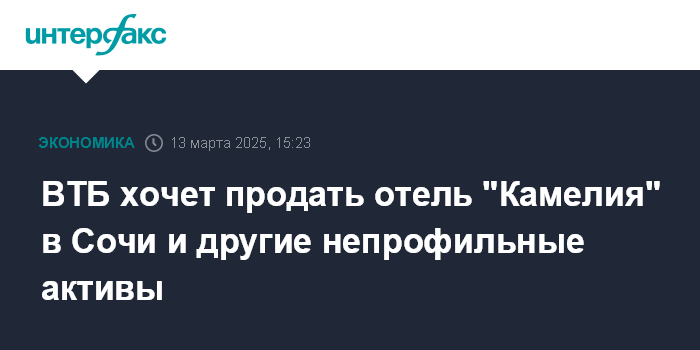 Москва. 13 марта. INTERFAX.RU - ВТБ в 2025 году планирует продать ряд непрофильных активов на несколько десятков миллиардов рублей, включая гостиницу "Камелия" в Сочи, рассказал журналистам первый зампред ВТБ Дмитрий Пьянов.