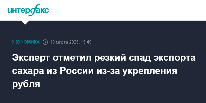 Москва. 13 марта. INTERFAX.RU - Экспорт российского сахара из-за укрепления рубля практически остановился, в новый сезон (начнется в августе 2025 года) Россия может войти с избытком сахара, прогнозирует директор портала Sugar.ru Вадим Гомоз.