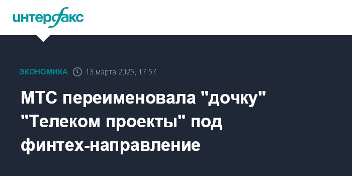 Москва. 13 марта. INTERFAX.RU - МТС переименовала дочернюю компанию ООО "Телеком проекты" в ООО "МТС Финтех", свидетельствуют данные ЕГРЮЛ.