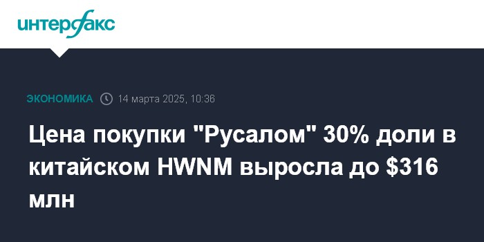 Цена покупки "Русалом" 30% доли в китайском HWNM выросла до $316 млн
