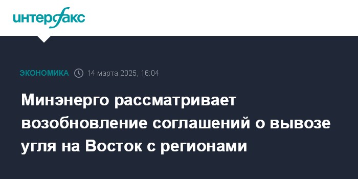 Москва. 14 марта. INTERFAX.RU - Министерство энергетики рассматривает вероятность возобновления соглашений с угледобывающими регионами о вывозе угольной продукции в восточном направлении, сообщило ведомство.