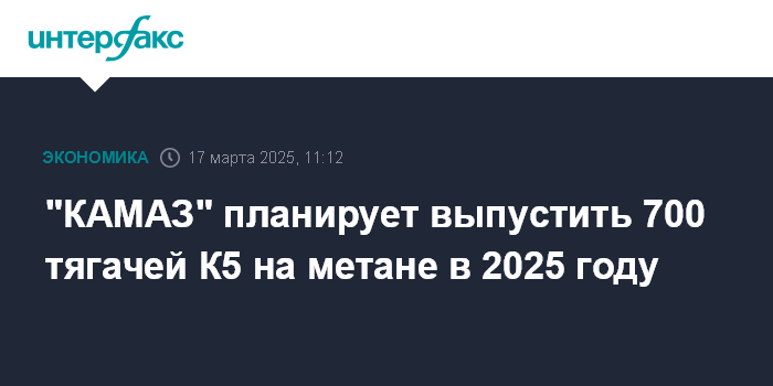 Москва. 17 марта. INTERFAX.RU - ПАО "КАМАЗ" планирует в 2025 году увеличить выпуск грузовиков флагманского поколения К5 (КАМАЗ-54901) на сжиженном природном газе (СПГ) в 3,5 раза до 700 штук, сообщила пресс-служба автопроизводителя.