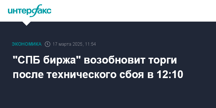 Москва. 17 марта. INTERFAX.RU - Торги ценными бумагами на "СПБ бирже" возобновятся с 12:10 по московскому времени, говорится в сообщении площадки.