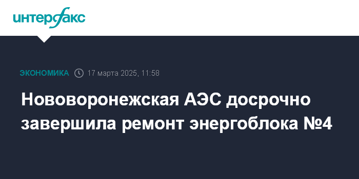 "14 марта 2025 года в 11:27 энергоблок №4 Нововоронежской АЭС включен в сеть после завершения планово-предупредительного ремонта (ППР), который продлился 30 суток. На 100% мощности энергоблок №4 НВАЭС был выведен 15 марта в 04:30", - говорится в сообщении.