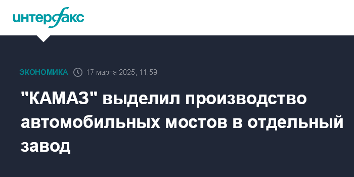 Москва. 17 марта. INTERFAX.RU - ПАО "КАМАЗ" для повышения эффективности управления выделил производство автомобильных мостов в отдельную структуру - завод мостов, сообщила пресс-служба компании.