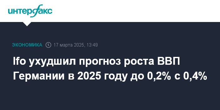 Москва. 17 марта. INTERFAX.RU - Экономика Германии в 2025 году вырастет на 0,2%, прогнозирует Мюнхенский институт экономических исследований (Ifo).