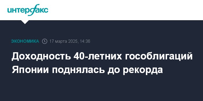 Москва. 17 марта. INTERFAX.RU - Доходность 40-летних государственных облигаций Японии достигла исторического максимума в преддверии очередного размещения госдолга с длинными сроками погашения, сообщает Bloomberg.