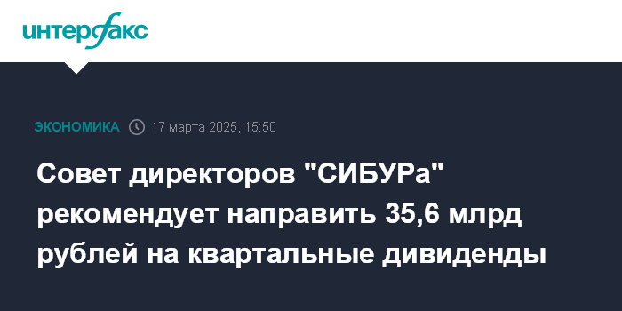 Москва. 17 марта. INTERFAX.RU - Совет директоров "СИБУРа" рекомендовал акционерам направить на дивиденды за IV квартал 2024 года 35,6 млрд рублей, сообщила компания.
