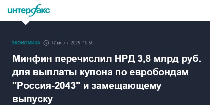 Минфин перечислил НРД 3,8 млрд руб. для выплаты купона по евробондам "Россия-2043" и замещающему выпуску