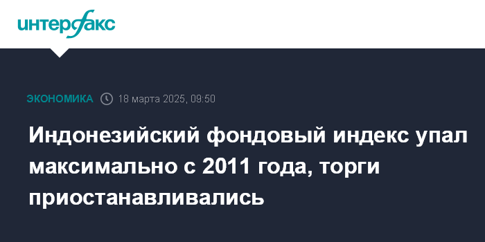 Торги на Индонезийской фондовой бирже были приостановлены на 30 минут после того, как снижение Jakarta Composite достигло 5%. Это была первая приостановка торгов на бирже со времен пандемии COVID-19.