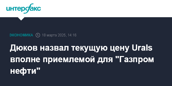 Москва. 18 марта. INTERFAX.RU - Текущая цена российской нефти Urals вполне приемлема для "Газпром нефти", заявил журналистам глава компании Александр Дюков.