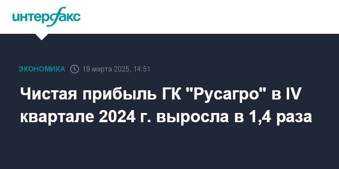 Москва. 19 марта. INTERFAX.RU - Чистая прибыль ГК "Русагро", одного из ведущих агрохолдингов РФ, в IV квартале 2024 года составила 12,4 млрд рублей, что в 1,4 раза больше, чем за аналогичный период предыдущего года, сообщается в пресс-релизе компании.