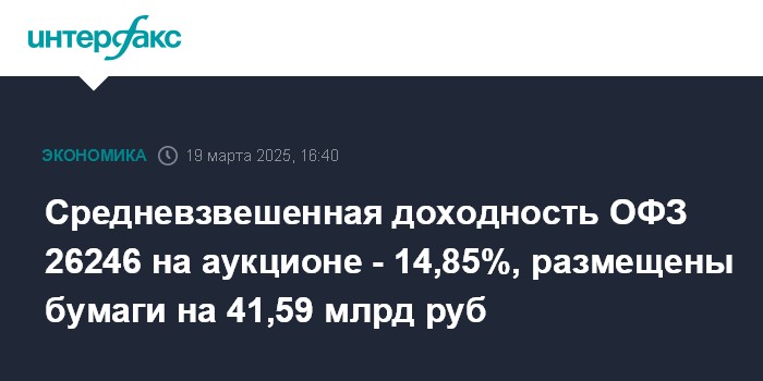 Средневзвешенная доходность ОФЗ 26246 на аукционе - 14,85%, размещены бумаги на 41,59 млрд руб