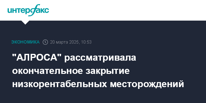 Москва. 20 марта. INTERFAX.RU - "АЛРОСА", прорабатывая варианты сокращения издержек на фоне затянувшегося кризиса на алмазном рынке, рассматривала окончательное закрытие низкорентабельных месторождений, говорится в обращении руководства компании к трудовому коллективу, копия которого есть в распоряжении "Интерфакса".