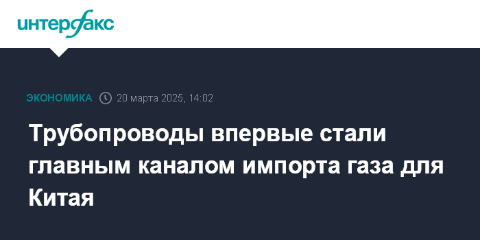 Москва. 20 марта. INTERFAX.RU - Доля трубопроводных поставок в китайском газовом импорте в январе 2025 года впервые превысила половину, свидетельствуют данные Главного таможенного управления КНР.
