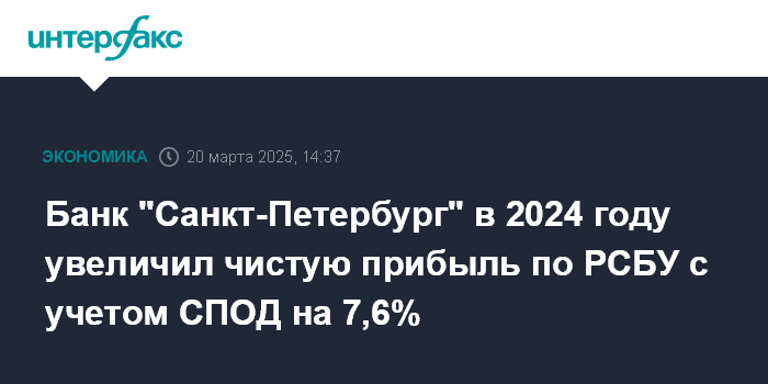 Банк "Санкт-Петербург" в 2024 году увеличил чистую прибыль по РСБУ с учетом СПОД на 7,6%
