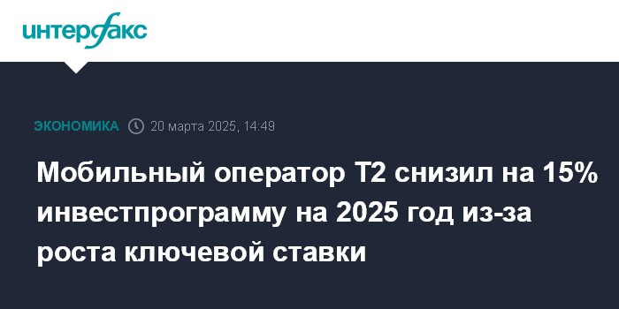Москва. 20 марта. INTERFAX.RU - ООО "Т2 Мобайл" (мобильный оператор, работающий под брендом Т2) скорректировало объем инвестиционных программ 2025 года на фоне ситуации в экономике и высокой ключевой ставки ЦБ РФ. Об этом сообщил генеральный директор компании Антон Годовиков.