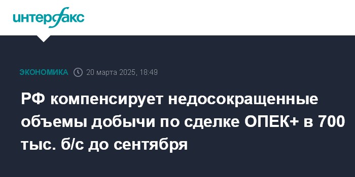РФ компенсирует недосокращенные объемы добычи по сделке ОПЕК+ в 700 тыс. б/с до сентября