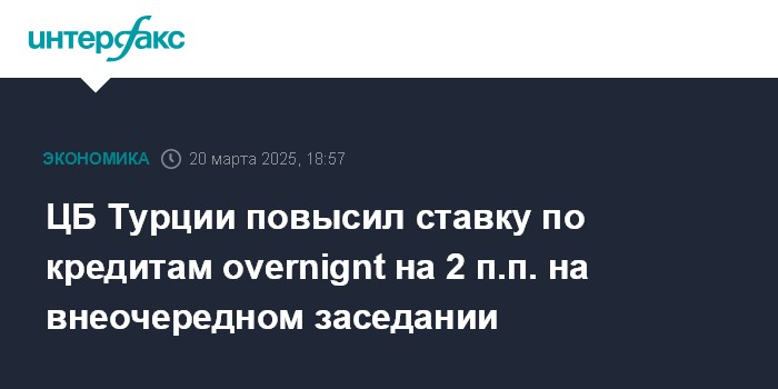 Москва. 20 марта. INTERFAX.RU - Центробанк Турции повысил ставку по кредитам overnignt на 2 процентных пункта - до 46% - на внеочередном заседании, стремясь поддержать лиру и ограничить последствия ее ослабления для инфляции.