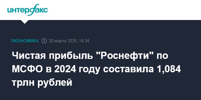 Чистая прибыль "Роснефти" по МСФО в 2024 году составила 1,084 трлн рублей