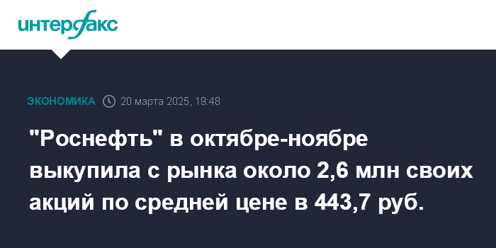 "Роснефть" в октябре-ноябре выкупила с рынка около 2,6 млн своих акций по средней цене в 443,7 руб.