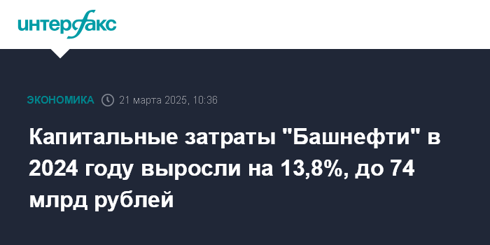 Капитальные затраты "Башнефти" в 2024 году выросли на 13,8%, до 74 млрд рублей