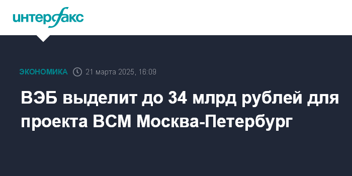 Москва. 21 марта. INTERFAX.RU - "ВЭБ.РФ" планирует выделить кредит на сумму не более 33,915 млрд рублей для проекта создания высокоскоростной магистрали (ВСМ) Москва - Санкт-Петербург, сообщает пресс-служба ВЭБа.