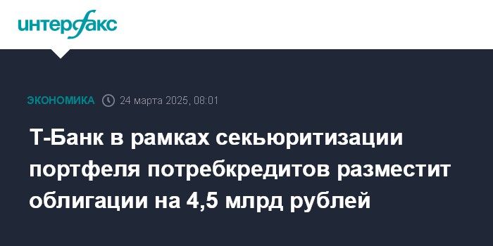 Москва. 24 марта. INTERFAX.RU - Т-Банк в рамках секьюритизации портфеля потребительских кредитов планирует разместить облигации объемом 4,5 млрд рублей. Об этом сообщил сам банк.