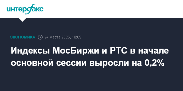 Москва. 24 марта. INTERFAX.RU - Российский рынок акций в начале основной сессии на "МосБирже" умеренно подрос в рамках коррекции после пятничного снижения, инвесторы ожидают итогов новых российско-американских переговоров в Саудовской Аравии; внешние рынки в начале недели подают смешанные сигналы и стабильна нефть (фьючерс на Brent торгуется выше $72 за баррель).