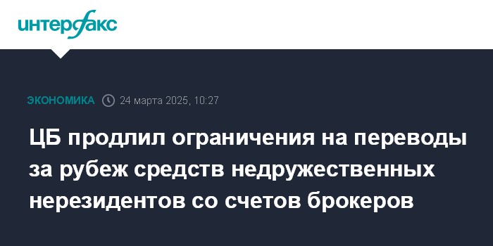 Такие операции ЦБ приостанавливает с 1 апреля до октября 2025 года. Ограничения касаются переводов со счетов как физических, так и юридических лиц, открытых у российских брокеров и доверительных управляющих. Они были введены с 1 апреля 2022 года.