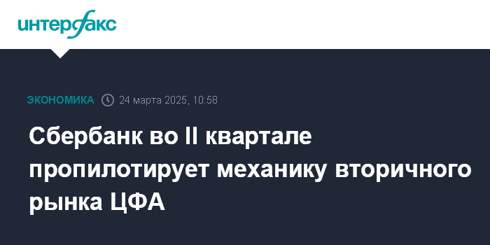 Москва. 24 марта. INTERFAX.RU - Сбербанк во втором квартале 2025 года на своей платформе пропилотирует механику вторичного рынка цифровых финансовых активов (ЦФА) на выпуске компании "Нацпроектстрой", говорится в сообщении кредитной организации.