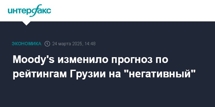 Москва. 24 марта. INTERFAX.RU - Международное рейтинговое агентство Moody's Ratings изменило прогноз по долгосрочным кредитным рейтингам Грузии в национальной и иностранной валюте на "негативный" со "стабильного", рейтинги подтверждены на уровне "Ba2", сообщило агентство.