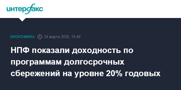 Москва. 24 марта. INTERFAX.RU - Негосударственные пенсионные фонды (НПФ) по итогам 2024 года обеспечили участникам программы долгосрочных сбережений (ПДС) доходность в среднем на уровне 20% годовых, сообщила телеканалу ОТР начальник отдела регулирования негосударственных пенсионных фондов Минфина Наталия Каменская.