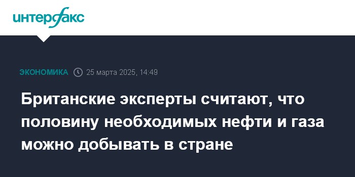 Москва. 25 марта. INTERFAX.RU - Великобритания может добывать внутри страны половину прогнозируемых объемов потребления нефти и газа при правильных деловых условиях, что позволит уменьшить зависимость от импорта, прогнозирует отраслевая ассоциация Offshore Energies UK (OEUK).