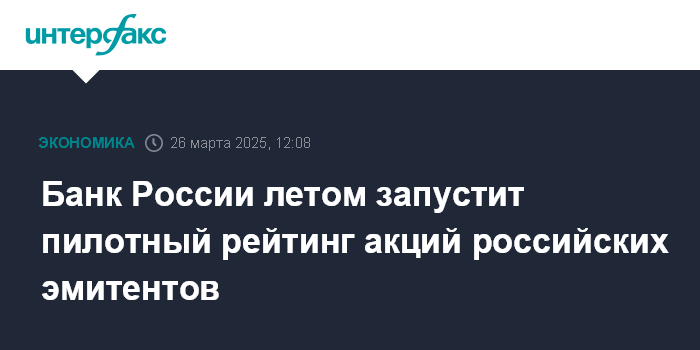 Москва. 26 марта. INTERFAX.RU - Банк России планирует летом 2025 года запустить в пилотном режиме проект по рейтингованию акций российских компаний; полноценно механизм должен заработать в 2026 году, сообщила "РБК Инвестициям" руководитель департамента корпоративных отношений ЦБ Екатерина Абашеева.