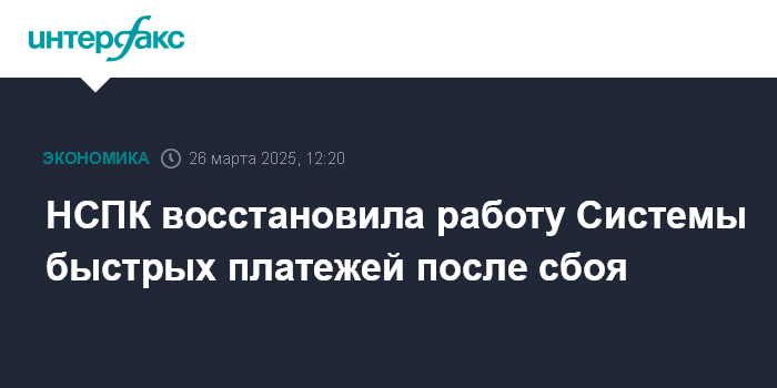 Москва. 26 марта. INTERFAX.RU - Национальная система платежных карт (НСПК, оператор Системы быстрых платежей) восстановила работу СБП после краткосрочного сбоя, сообщили "Интерфаксу" в пресс-службе НСПК.