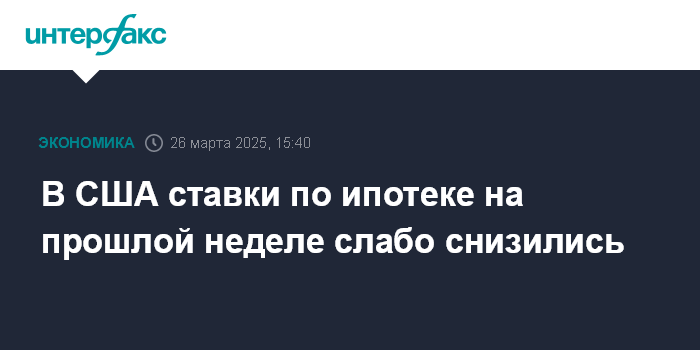 Москва. 26 марта. INTERFAX.RU - В США средний размер ставок по долгосрочным ипотечным кредитам в США понизился на 1 базисный пункт на прошлой неделе, сообщила Ассоциация ипотечных банкиров (MBA).