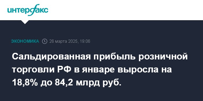 Москва. 26 марта. INTERFAX.RU - Сальдированная прибыль организаций розничной торговли РФ в январе 2025 года увеличилась на 18,8% до 84,2 млрд рублей, сообщил Росстат в среду.