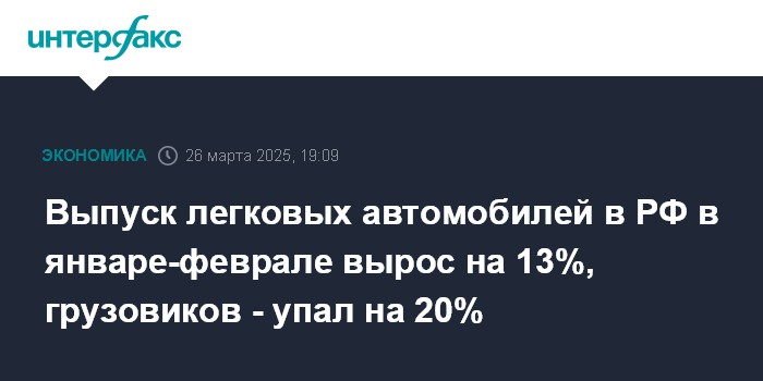 Москва. 26 марта. INTERFAX.RU - Производство легковых автомобилей в РФ в январе-феврале 2025 года выросло на 12,8%, выпуск грузовиков за тот же период упал на 20,1%. Об этом сообщила Федеральная служба государственной статистики (Росстат) в среду.