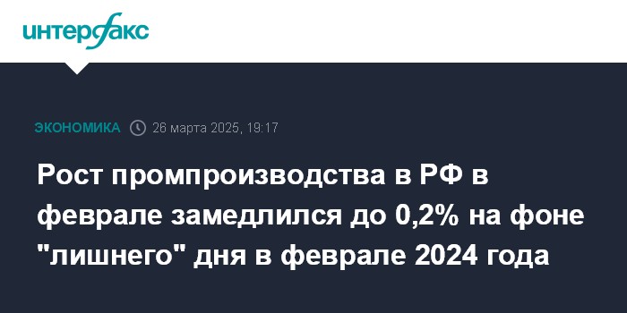 Данные по промышленности в феврале 2025 года оказались хуже ожиданий экономистов. Консенсус-прогноз аналитиков, опрошенных "Интерфаксом" в начале марта, предусматривал рост промпроизводства РФ за февраль на 1,1%. Во многом замедление годовых темпов роста в феврале объясняется високосным 2024 годом и "лишним" днем в феврале прошлого года.