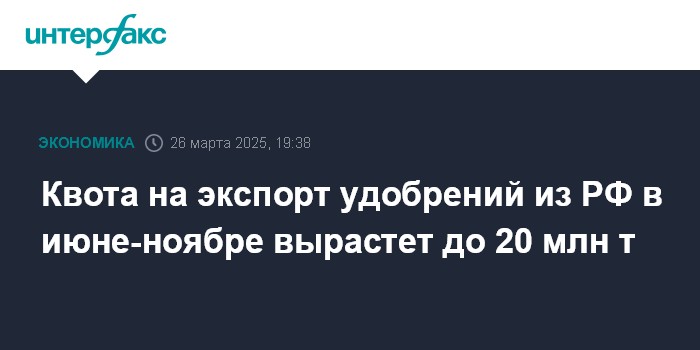 Москва. 26 марта. INTERFAX.RU - Подкомиссия по таможенно-тарифному и нетарифному регулированию, защитным мерам во внешней торговле поддержала предложение Минсельхоза РФ продлить квоту на вывоз минеральных удобрений на период с 1 июня по 30 ноября 2025 года, сообщила пресс-служба Минэкономразвития.