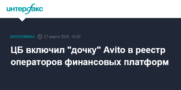 Москва. 27 марта. INTERFAX.RU - АО "Авито Финанс", которое является подразделением Avito по развитию финансовых сервисов, включено Банком России в реестр операторов финансовых платформ, сообщил регулятор.