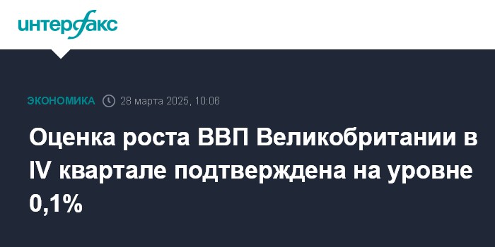 Москва. 28 марта. INTERFAX.RU - ВВП Великобритании в четвертом квартале 2024 года увеличился на 0,1% по сравнению с предыдущими тремя месяцами, говорится в отчете Национального статистического управления (ONS), представившего окончательные данные.
