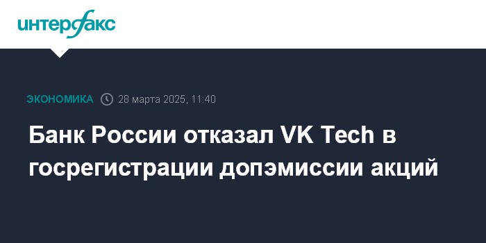 Москва. 28 марта. INTERFAX.RU - Банк России отказал ПАО "ВК Технологии" (VK Tech) в государственной регистрации допэмиссии обыкновенных акций и регистрации проспекта ценных бумаг, размещаемых по открытой подписке, сообщил регулятор.