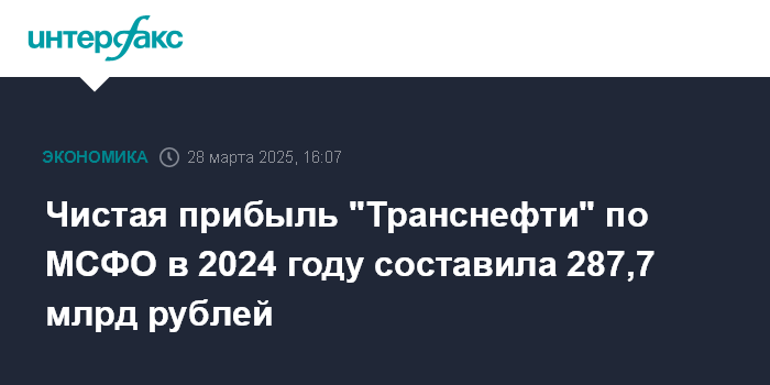 Москва. 28 марта. INTERFAX.RU - Чистая прибыль "Транснефти" по МСФО в 2024 году составила 287,7 млрд руб. против 304,2 млрд руб. годом ранее, сообщила компания.