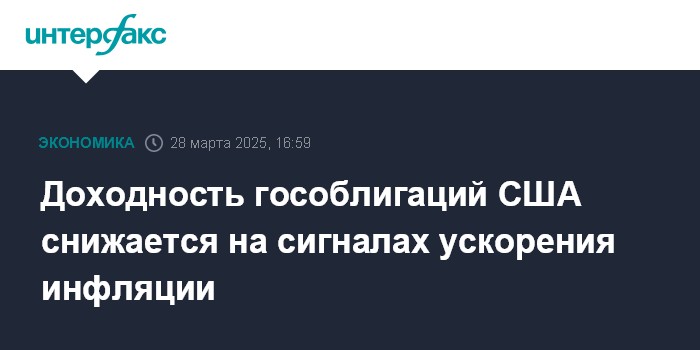 Москва. 28 марта. INTERFAX.RU - Доходность американских государственных облигаций снижается в пятницу, инвесторы оценивают сигналы ускорения инфляции в США.